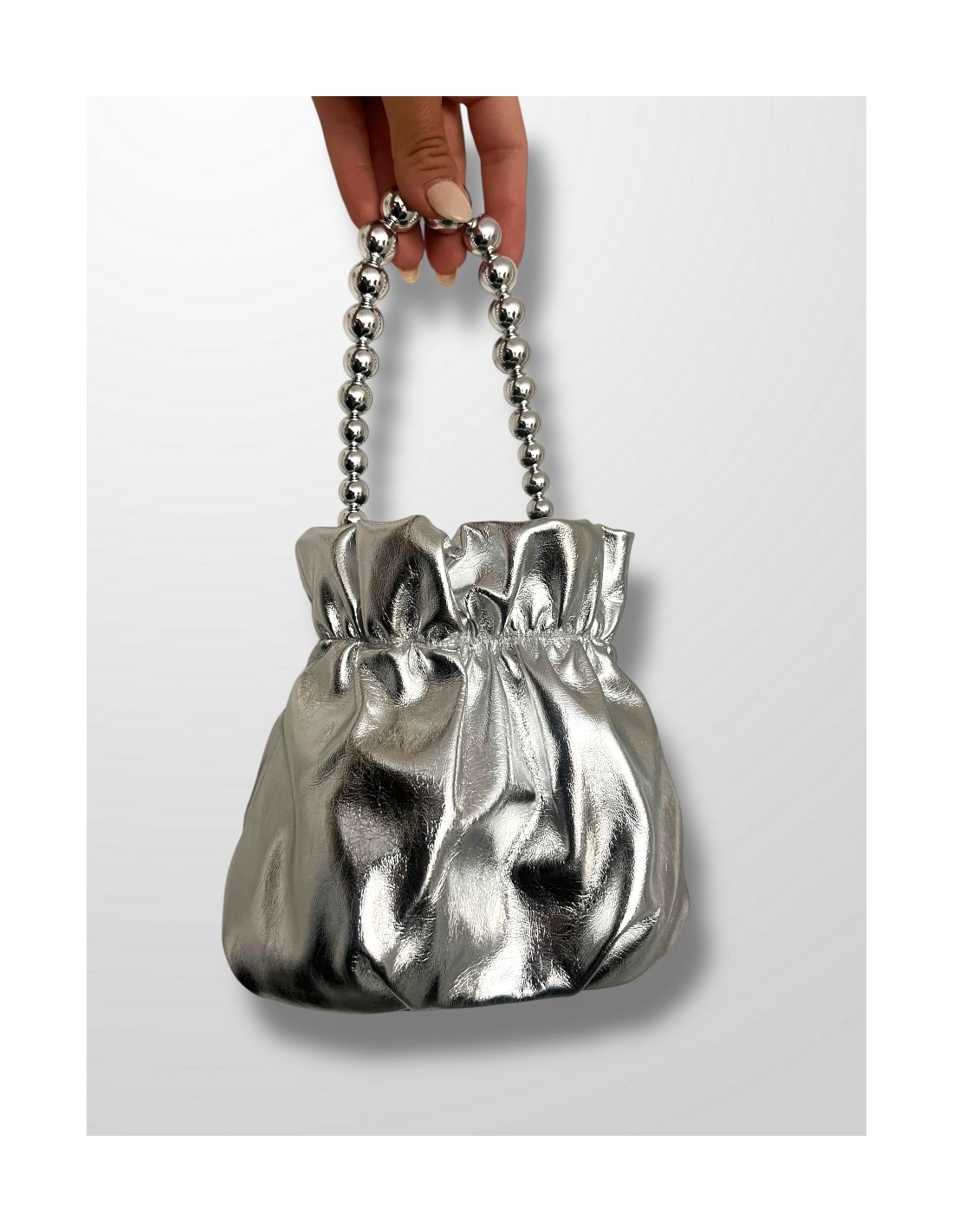 Bombonera de polipiel plateado con asa de bolitas y cadena larga para colgar.