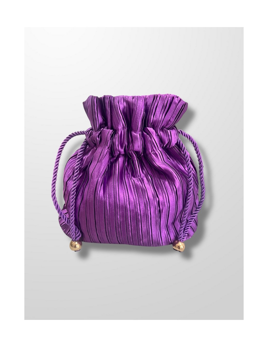 Bombonera de raso plisado con cordón de seda y cadenita para colgar.