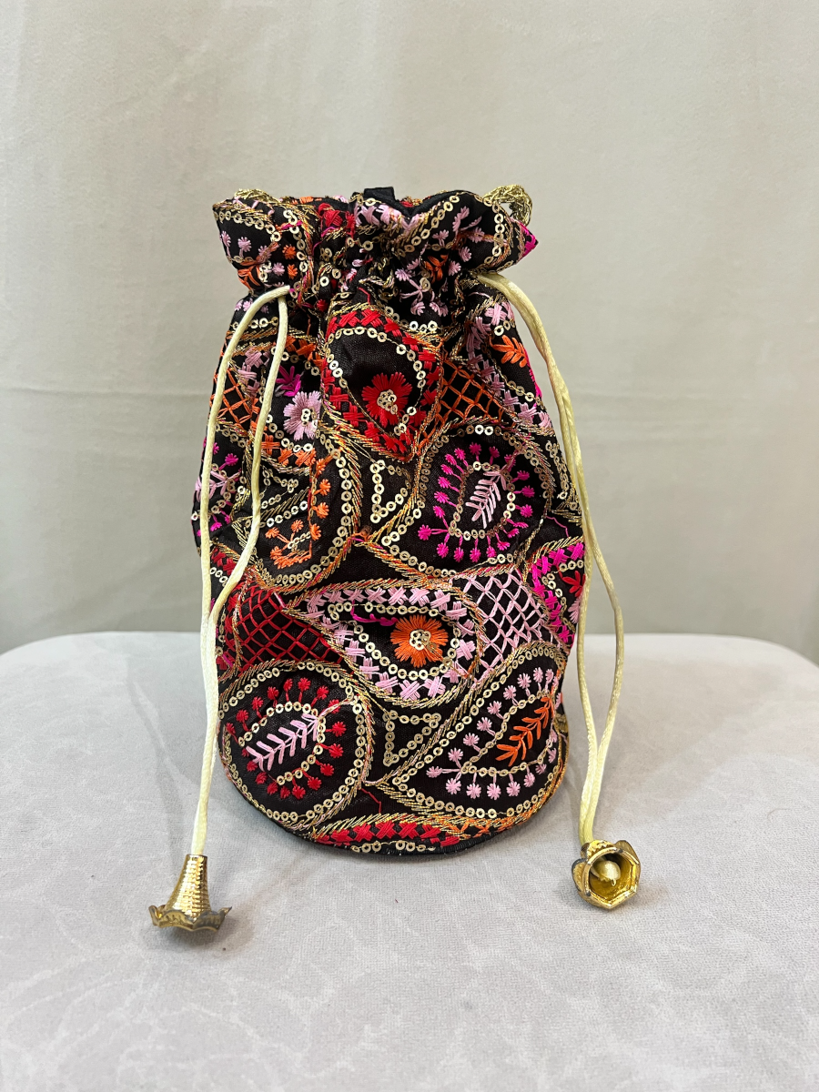 Bombonera con fondo negro y bordados en tonos naranjas, rosa, rojo y fucsia.