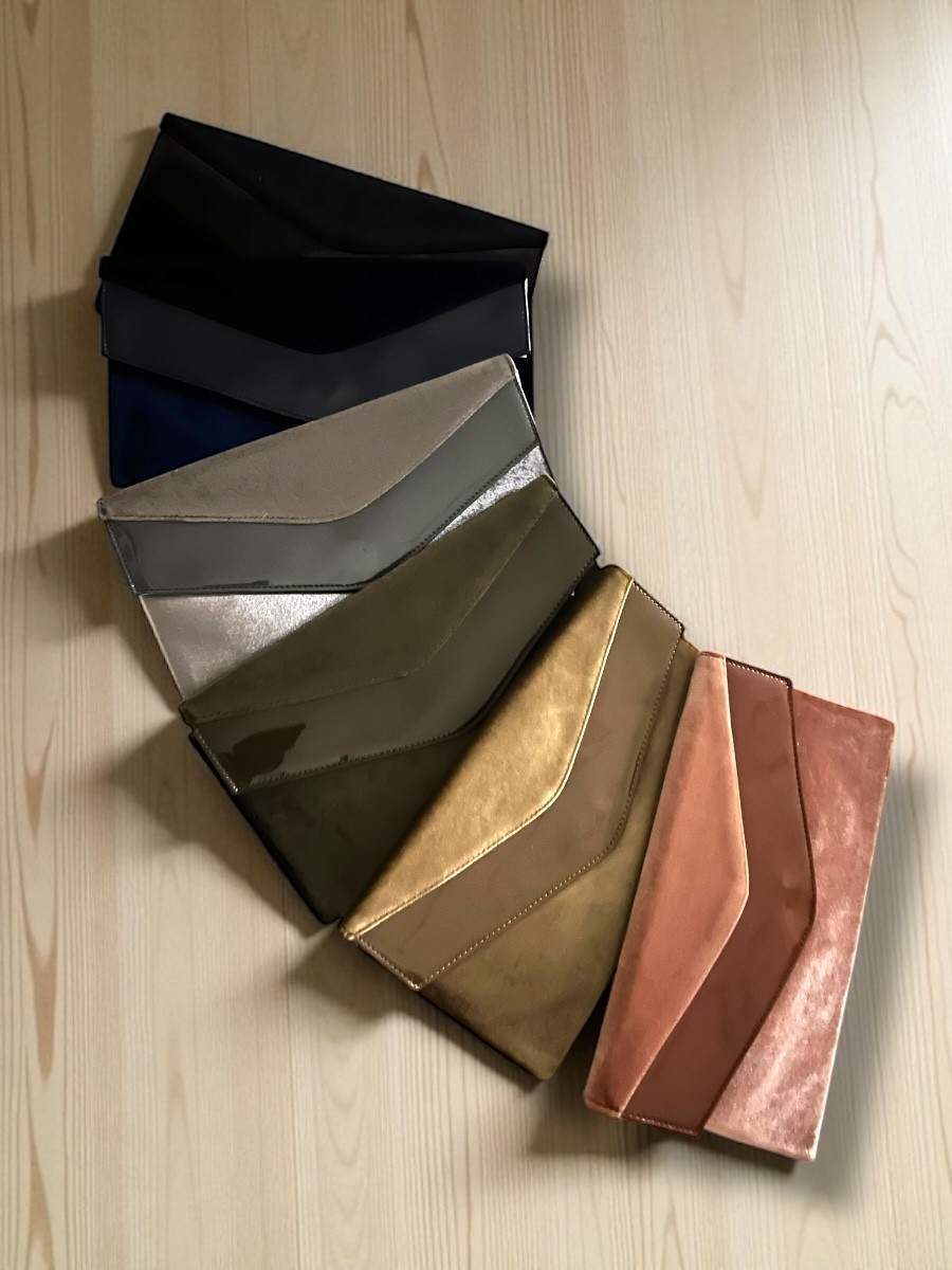 Bolso tipo sobre de terciopelo con detalle de polipiel en la solapa. Tiene cadenita para colgar.
