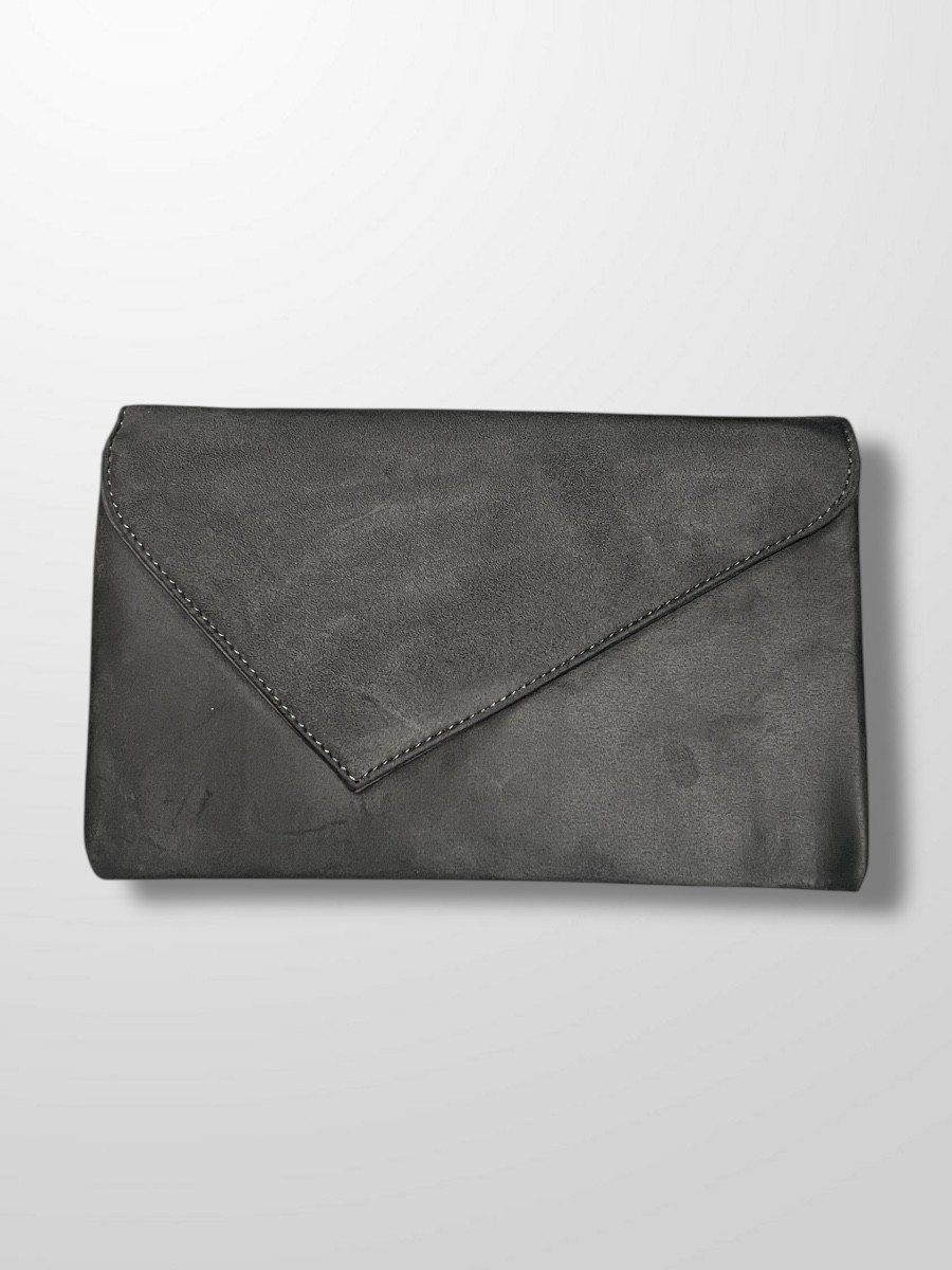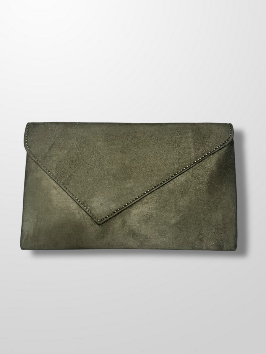 Cartera de invitada tipo sobre de antelina con cadena para colgar.