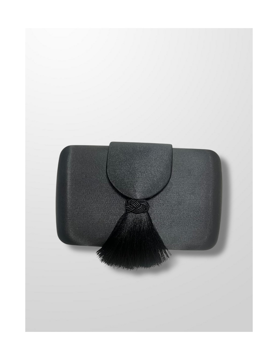 Clutch de raso con pequeña solapa y borla de flecos de seda a juego. Tiene cadenita dorada a juego.