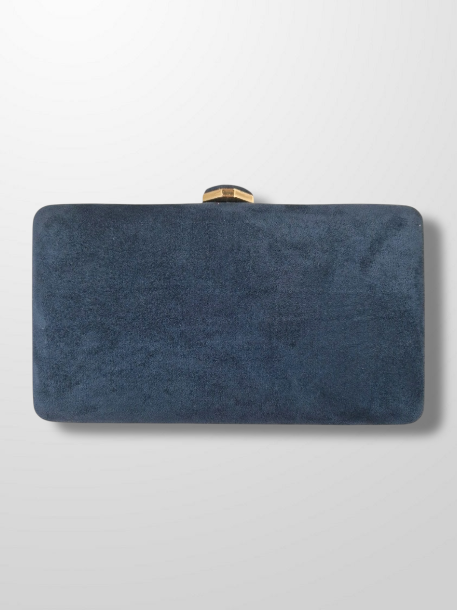 Clutch de antelina en color azul marino. Tiene cadenita para colgar.