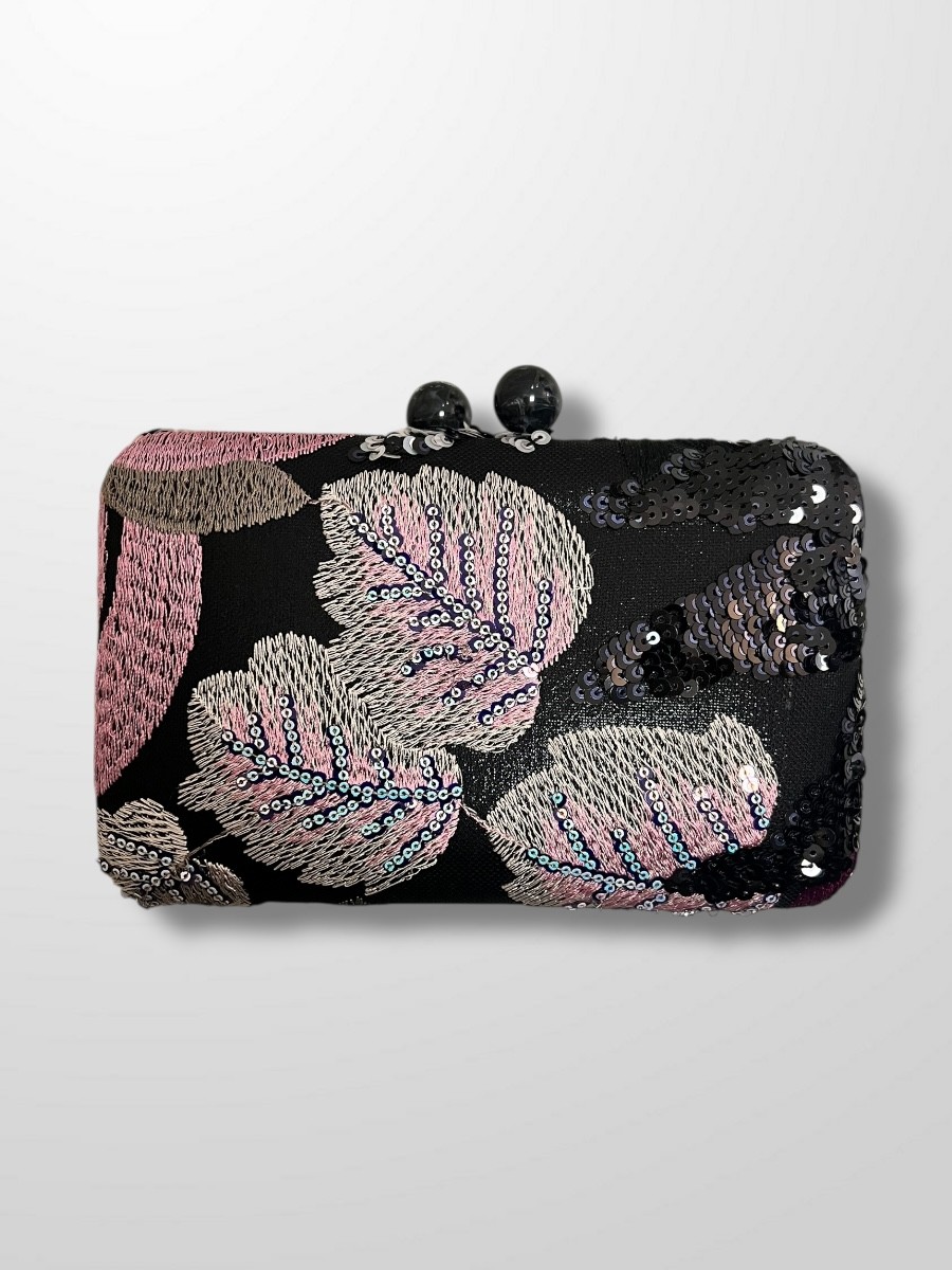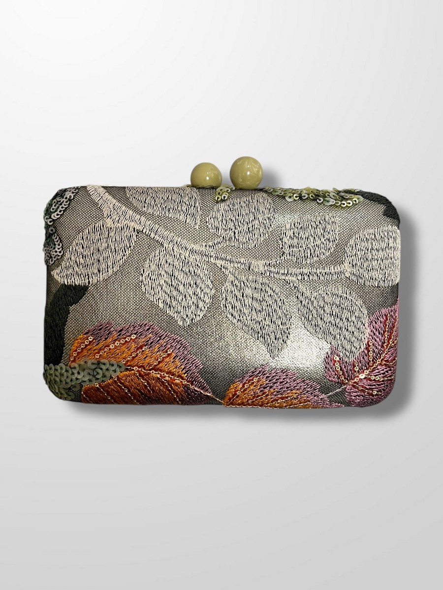 Clutch bordado con lentejuelas y cierre de bolitas. Si quieres dar protagonismo a tu bolso, este puede ser el ideal con la combinación de colores y materiales del bordado lo hace único.