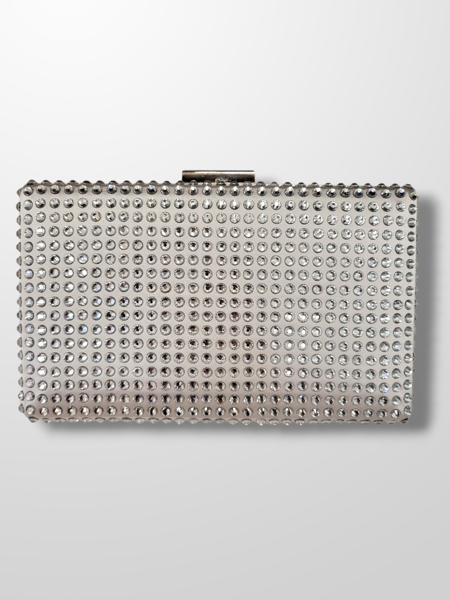Clutch de invitada con brillantes de strass en color plateado o dorado. Con cadenita para colgar. Medidas aproximadas: 20 cm x 12 cm