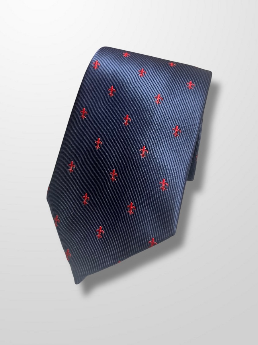 Corbata azul marino con estampado de flor de lis. Diseño clásico y atemporal.