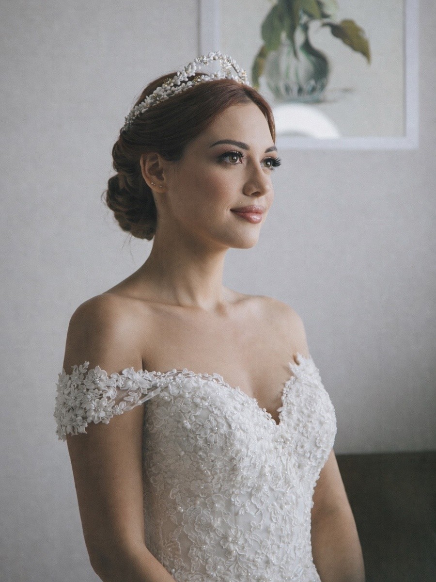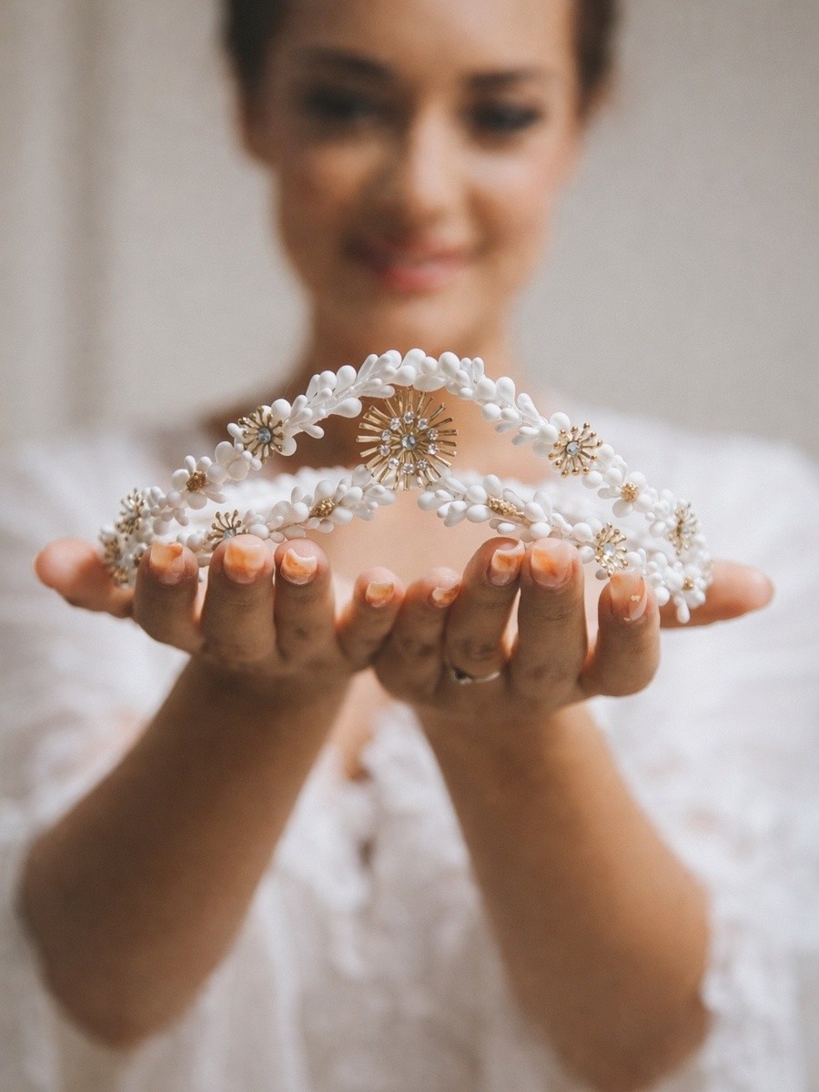 Corona de novia elaborada con pistilos blancos de porcelana y detalles en dorado que aportan un sutil brillo joya. Diseñada para realzar la belleza natural de novias con estilo romántico y atemporal.