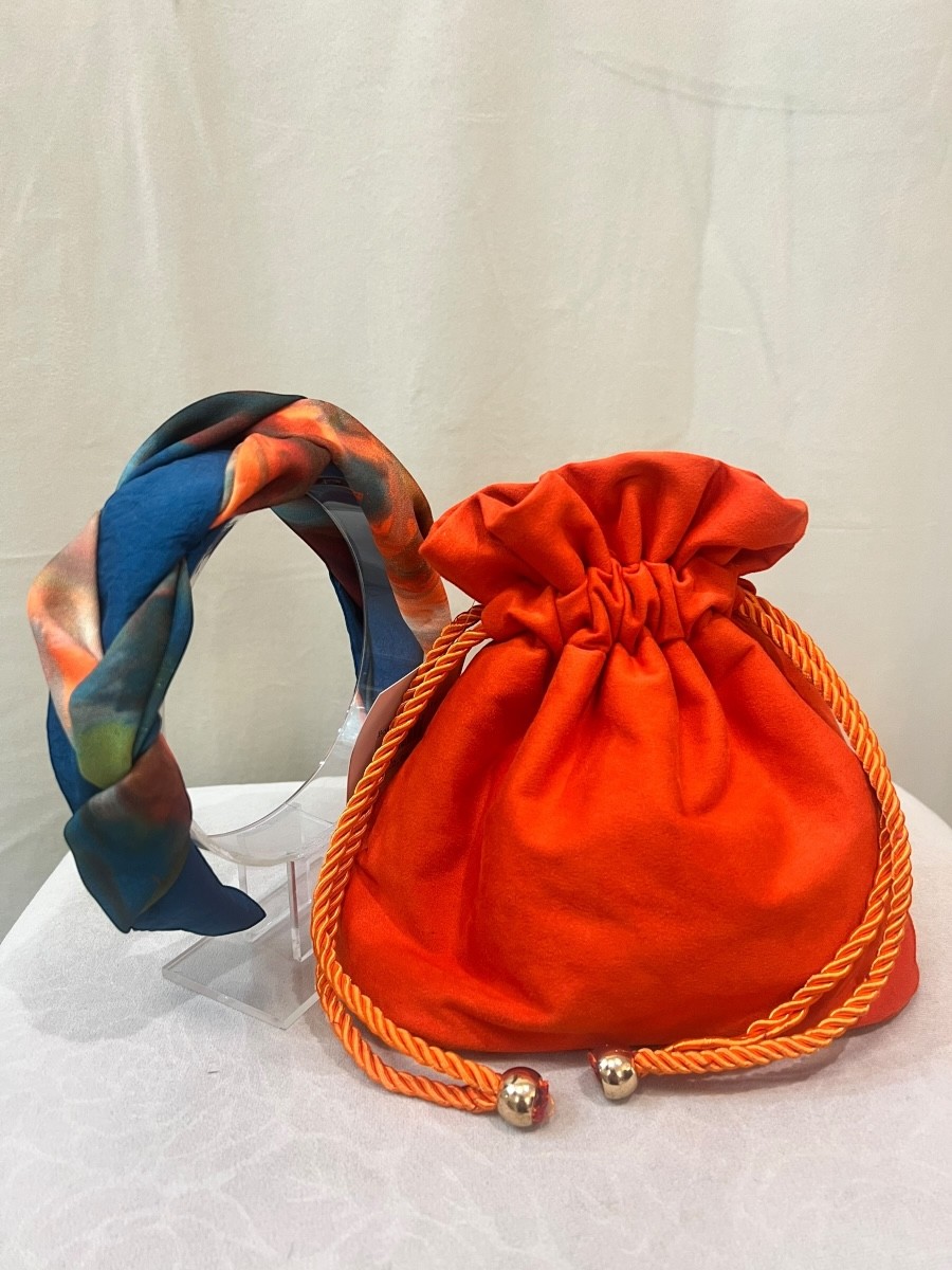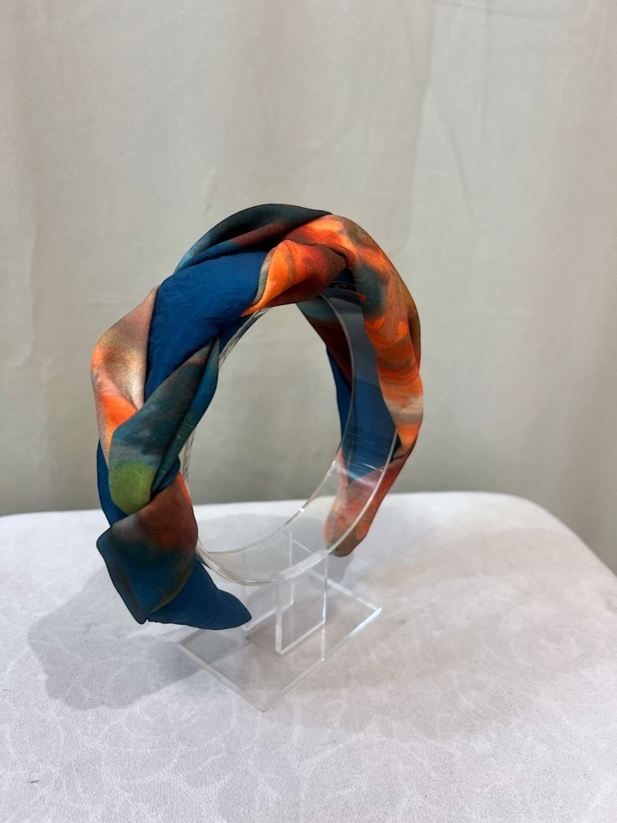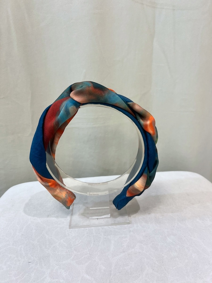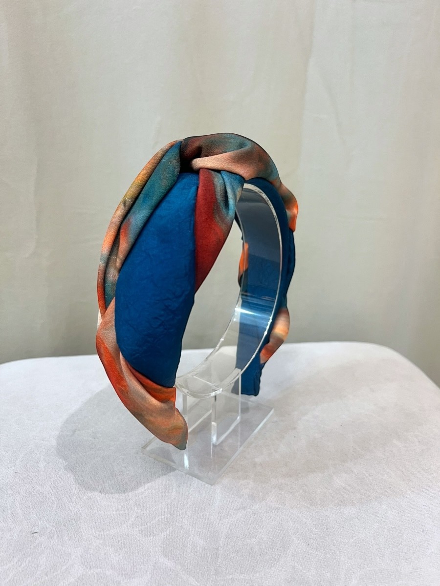 Diadema trenzada con telas en azul petróleo y estampada en tonos azules y naranjas.