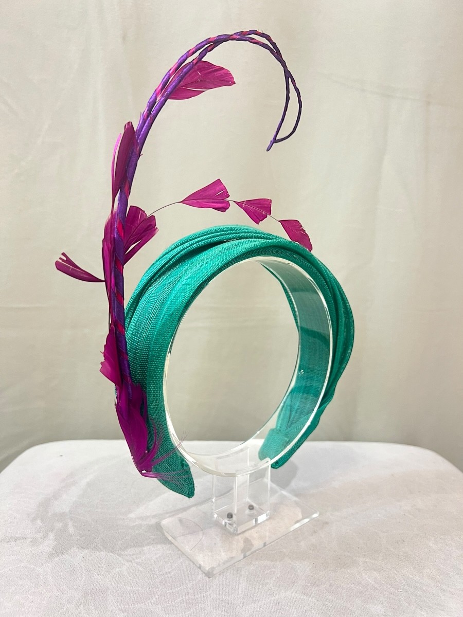 Diadema de sinamay seda verde con rakis en morado buganvilla. Estilosa y original.