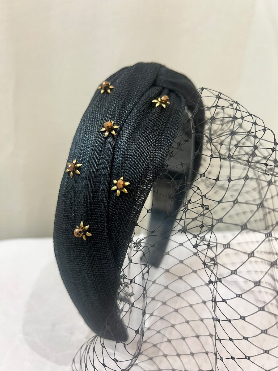 Diadema de sinamay seda negra con estrellitas de latón y velo a tono.