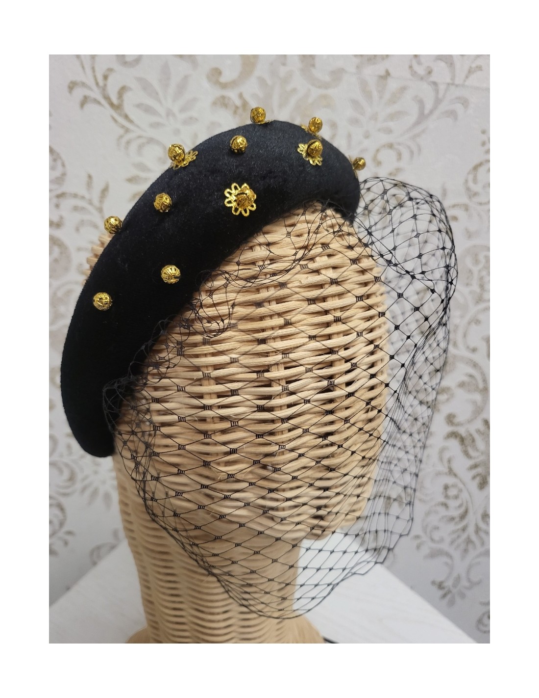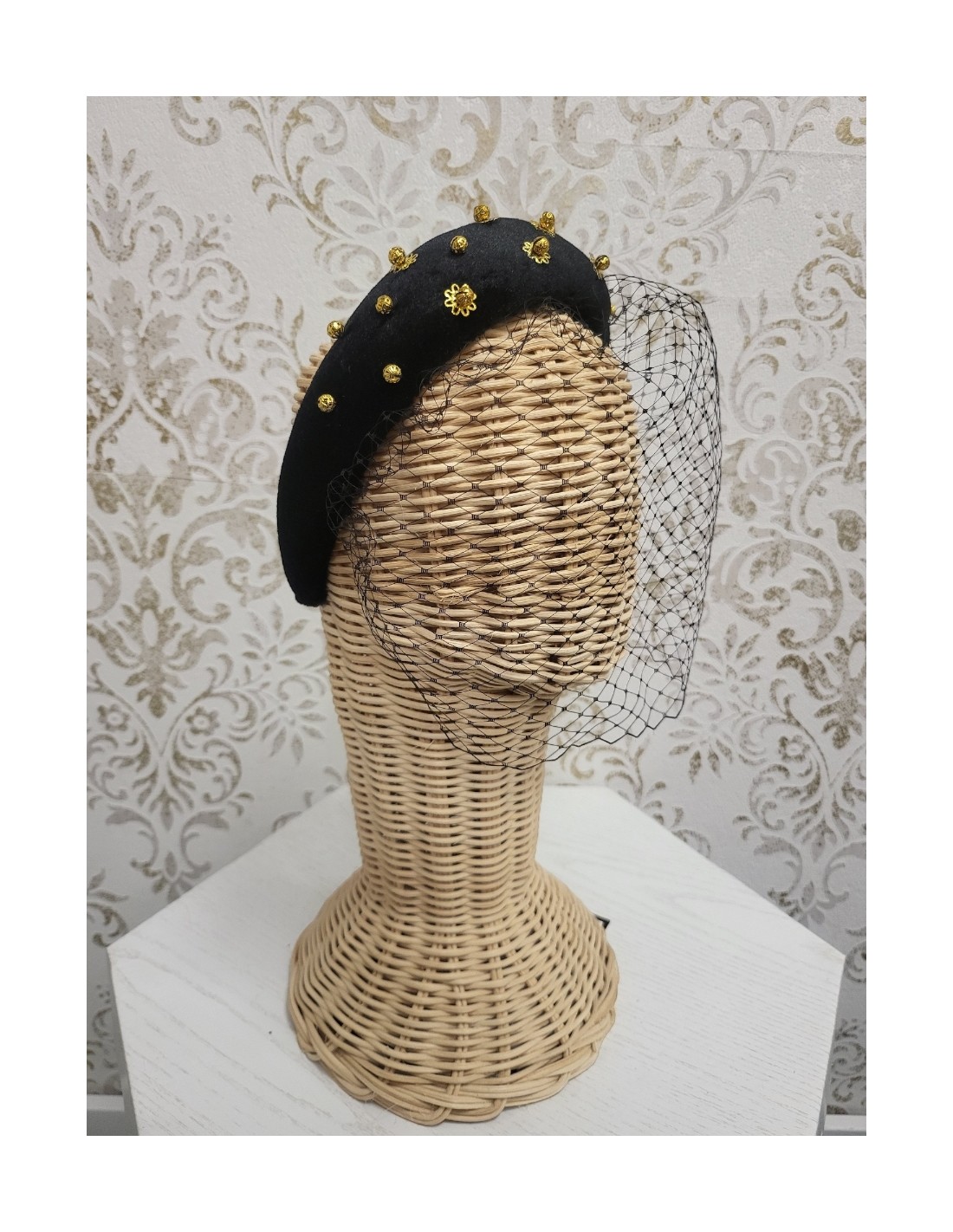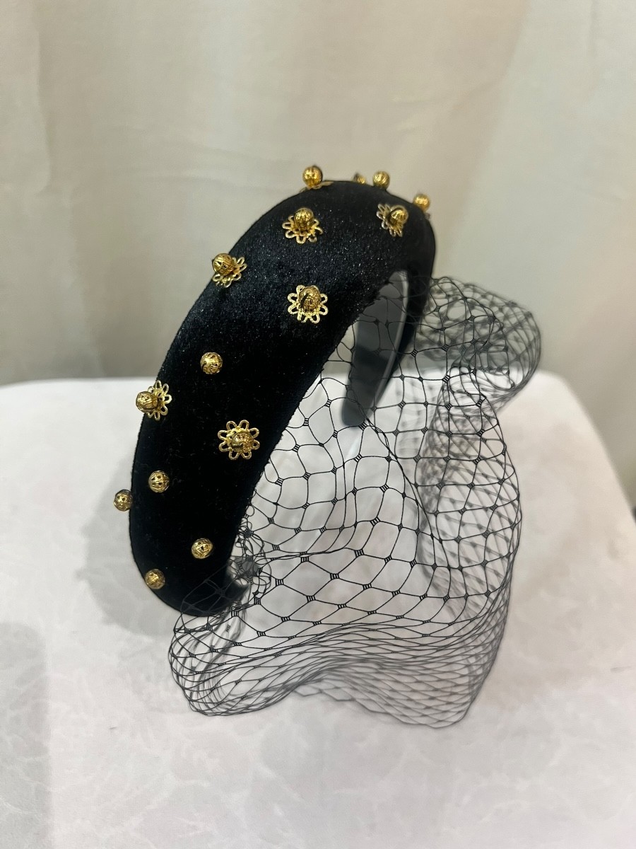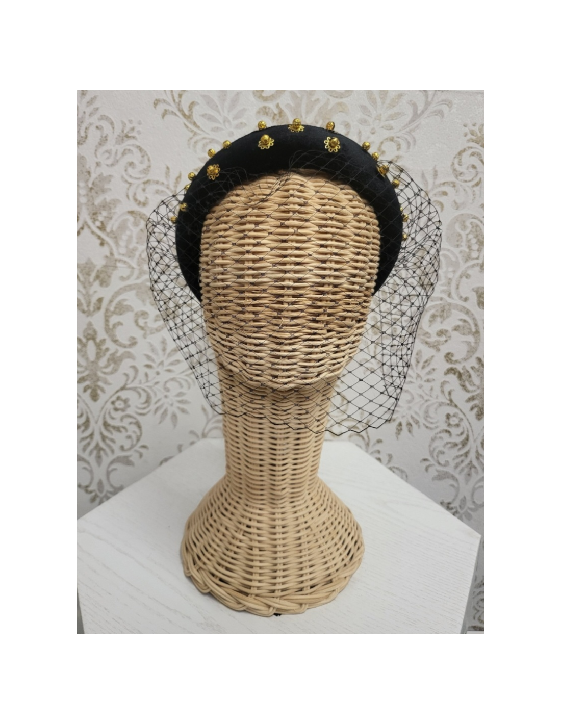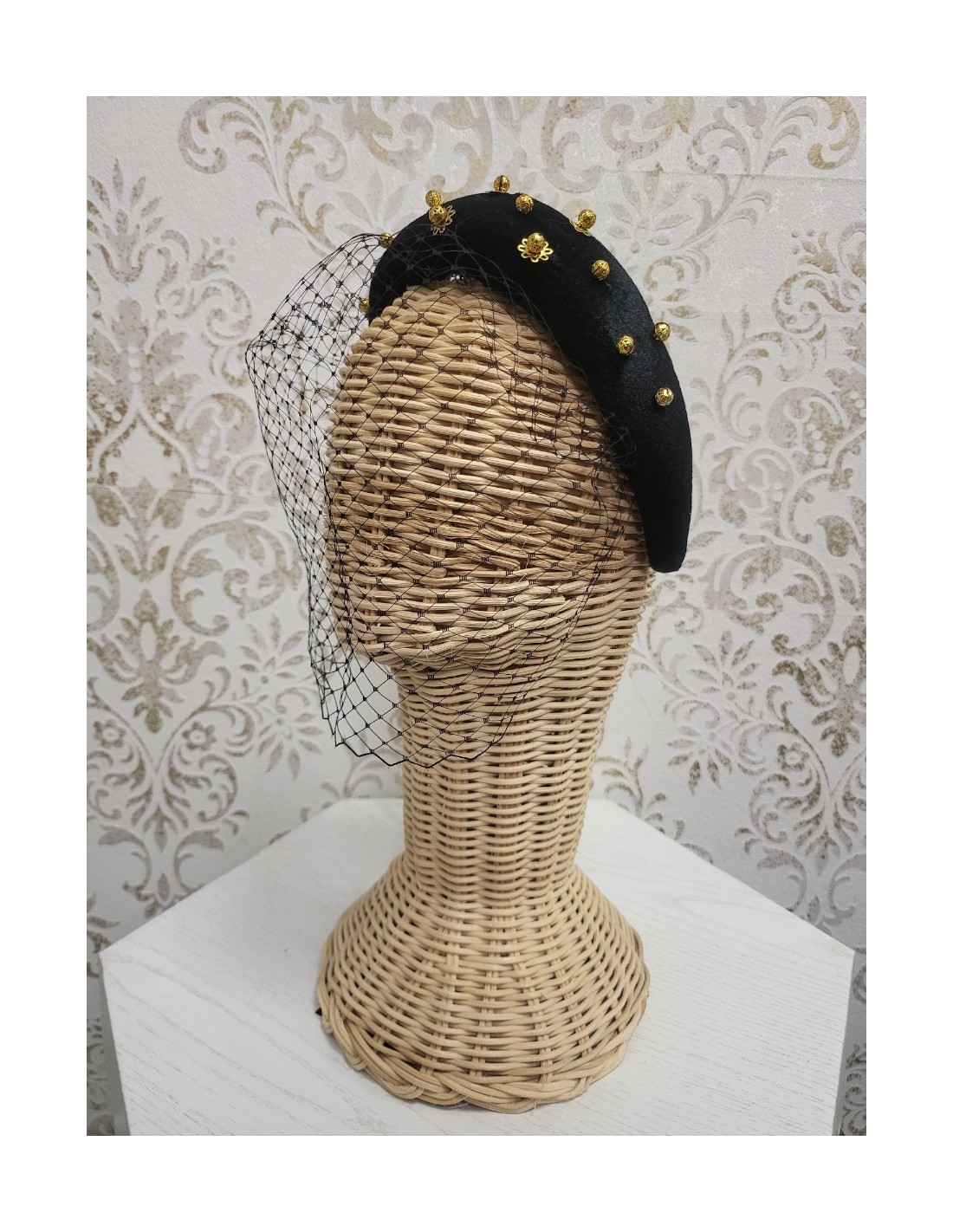 Diadema acolchada de terciopelo negro con rocallas en dorado y velo negro.