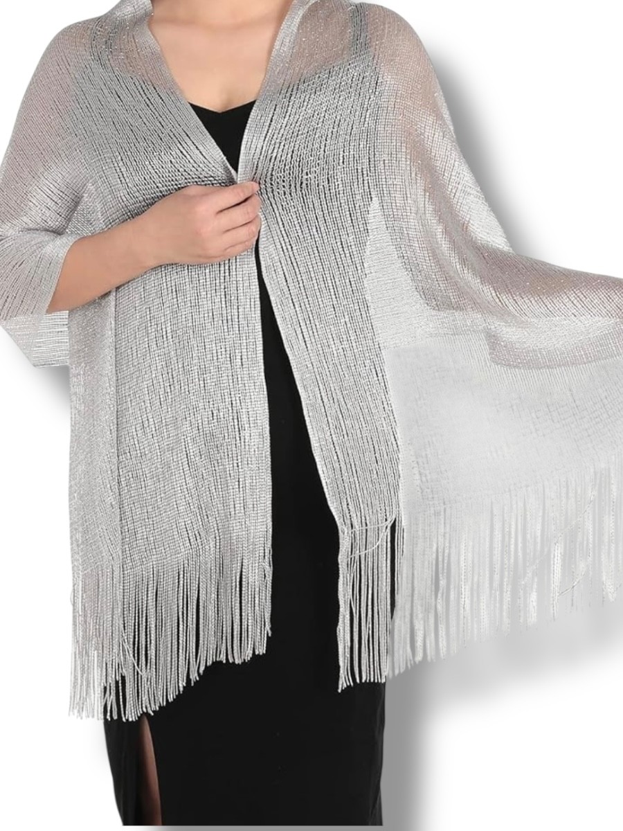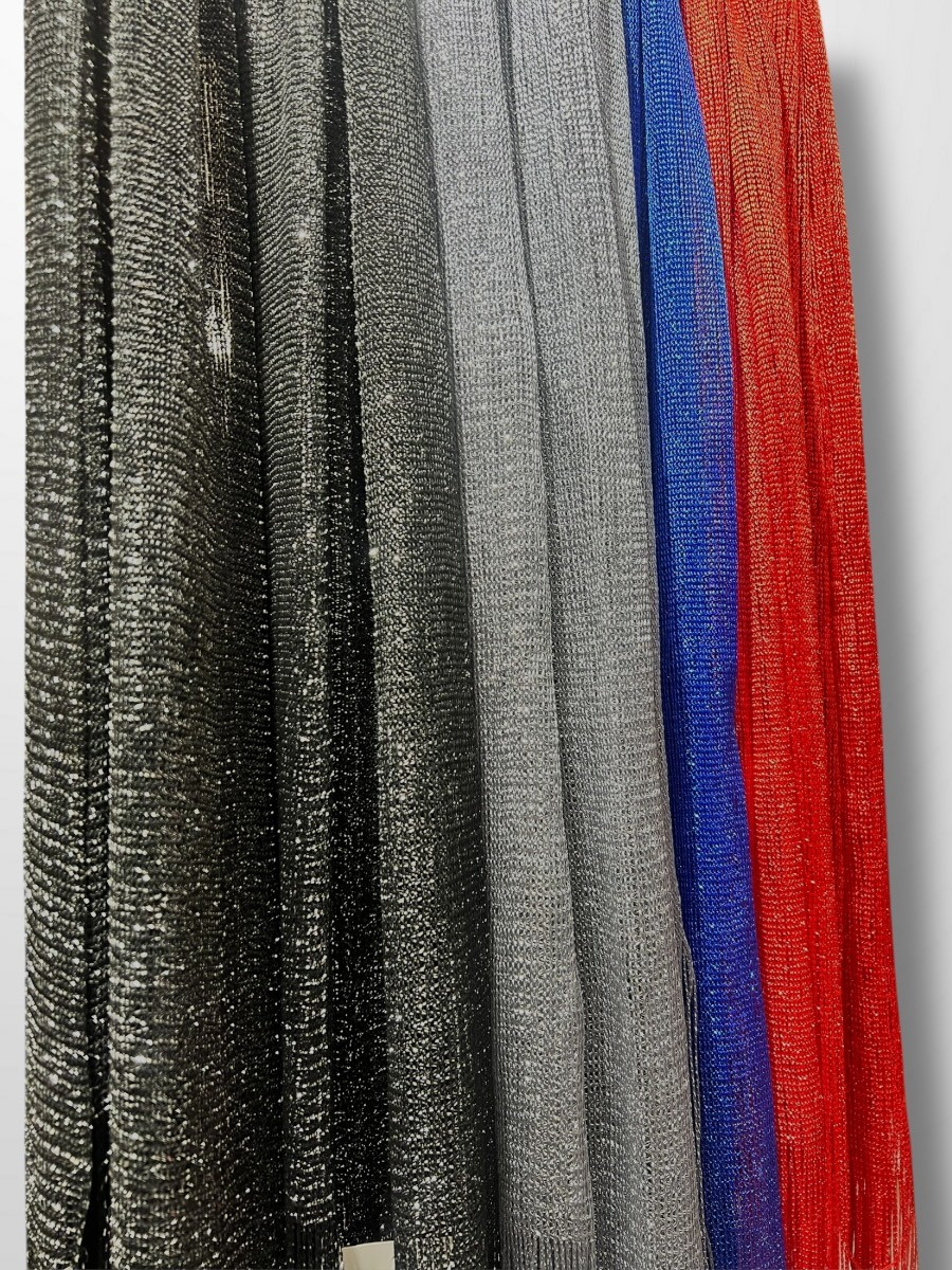 Fular efecto rejilla con brillo y flecos a tono.