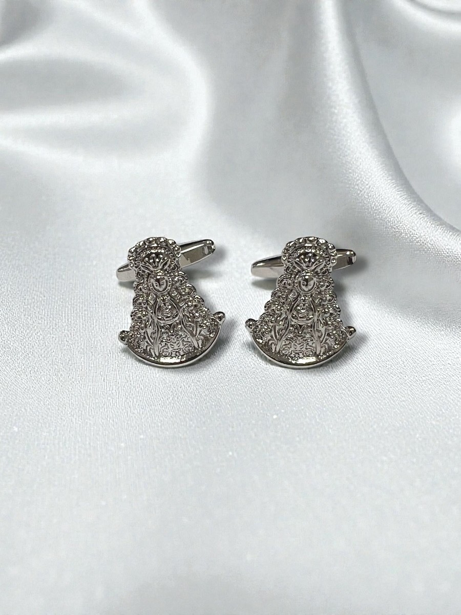 Gemelos plateados con la forma de la virgen del Rocío.