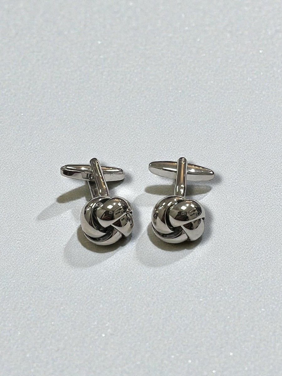 Gemelos de metal plateado con forma de nudo. Diseño clásico.
