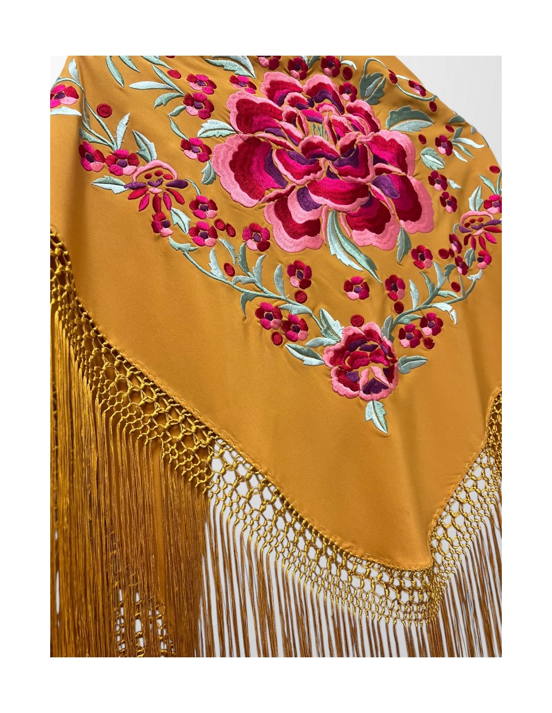 Mantoncillo de crespón con bordado en hilo de seda con forma de rosetón grande en tonos fucsia y buganvilla. Enrejado y flecado a mano de seda.