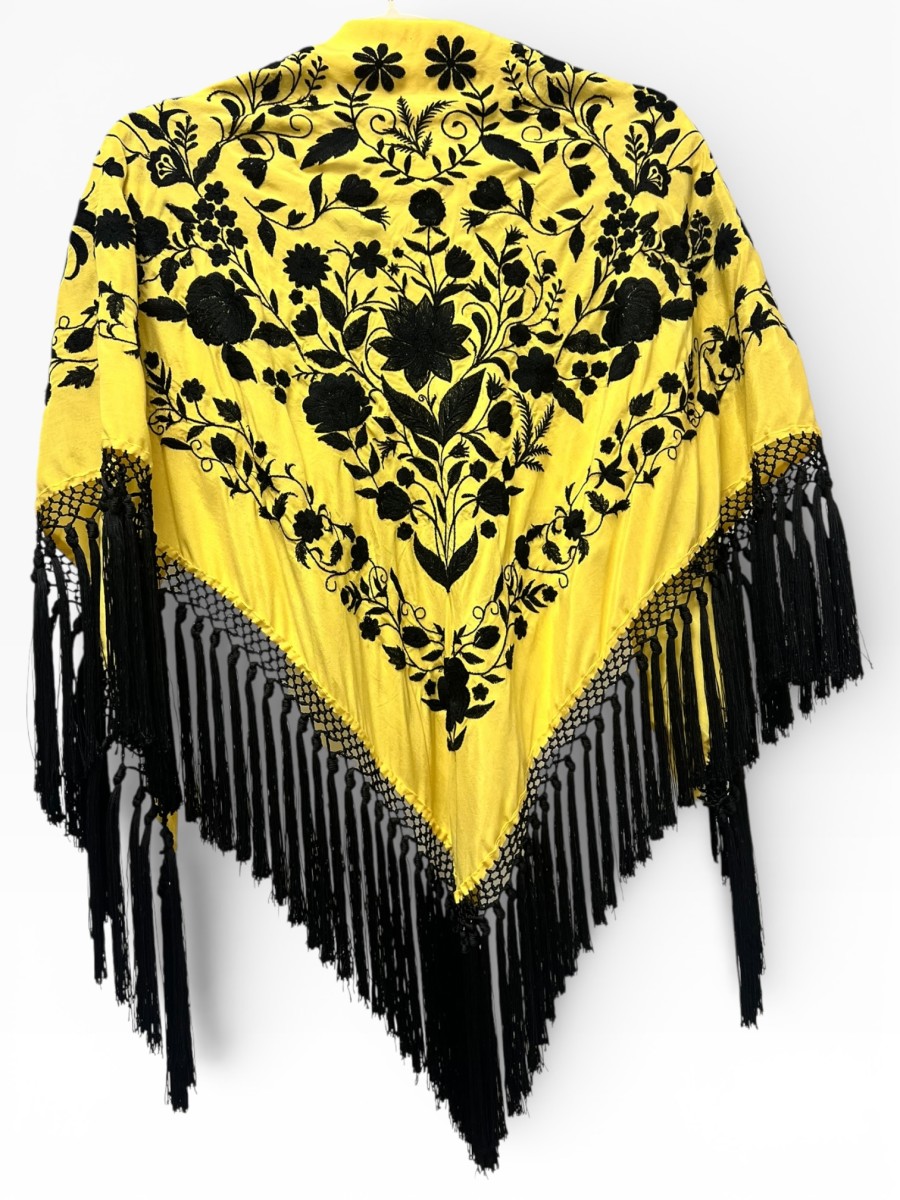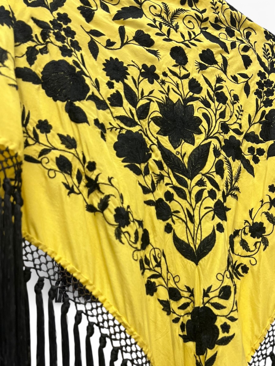Mantoncillo de seda con bordado y flecos negros. Estilo taurino.