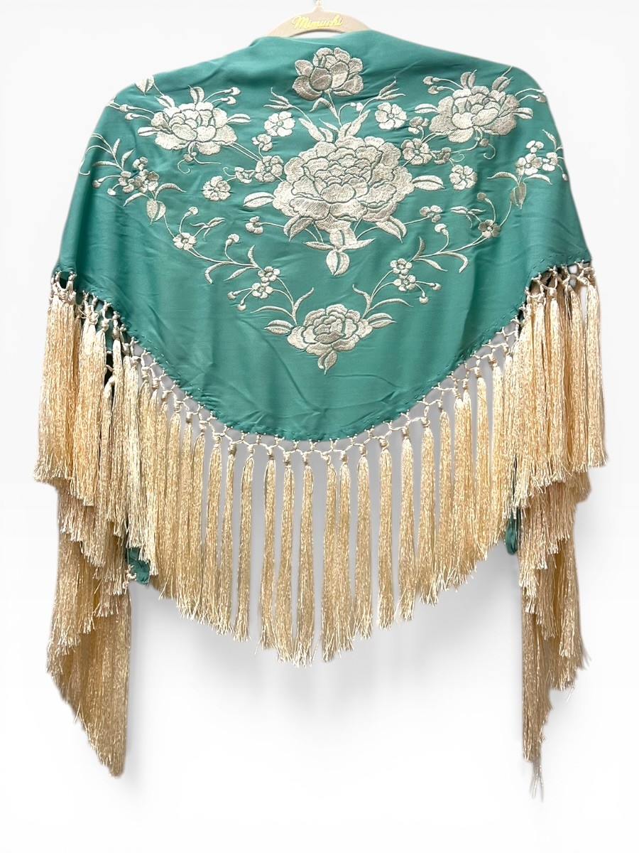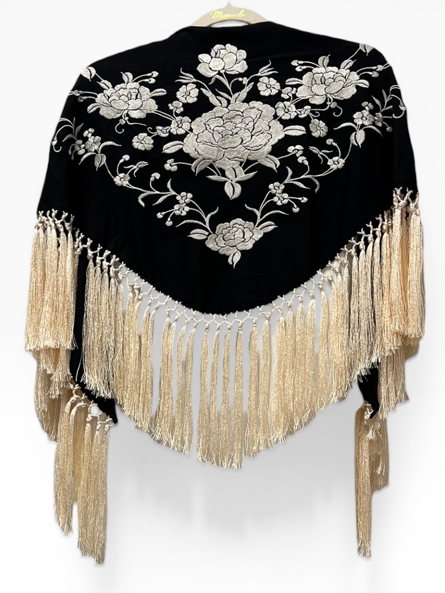 Mantoncillo de crespón de seda bordado con hilo marfil. Flecos de seda corto en color marfil.