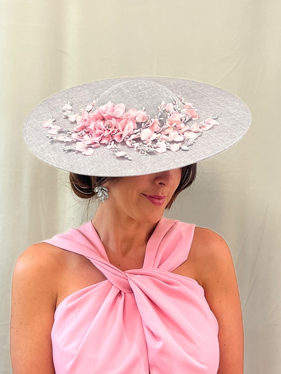 Pamela de fibra natural gris plata con ramificaciones de pistilos de porcelana pintados a mano en plata, rosa, malva y hortensias preservadas.