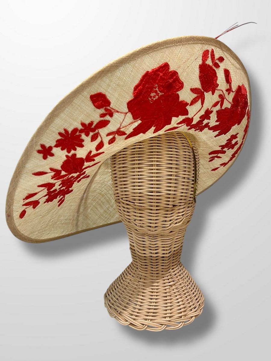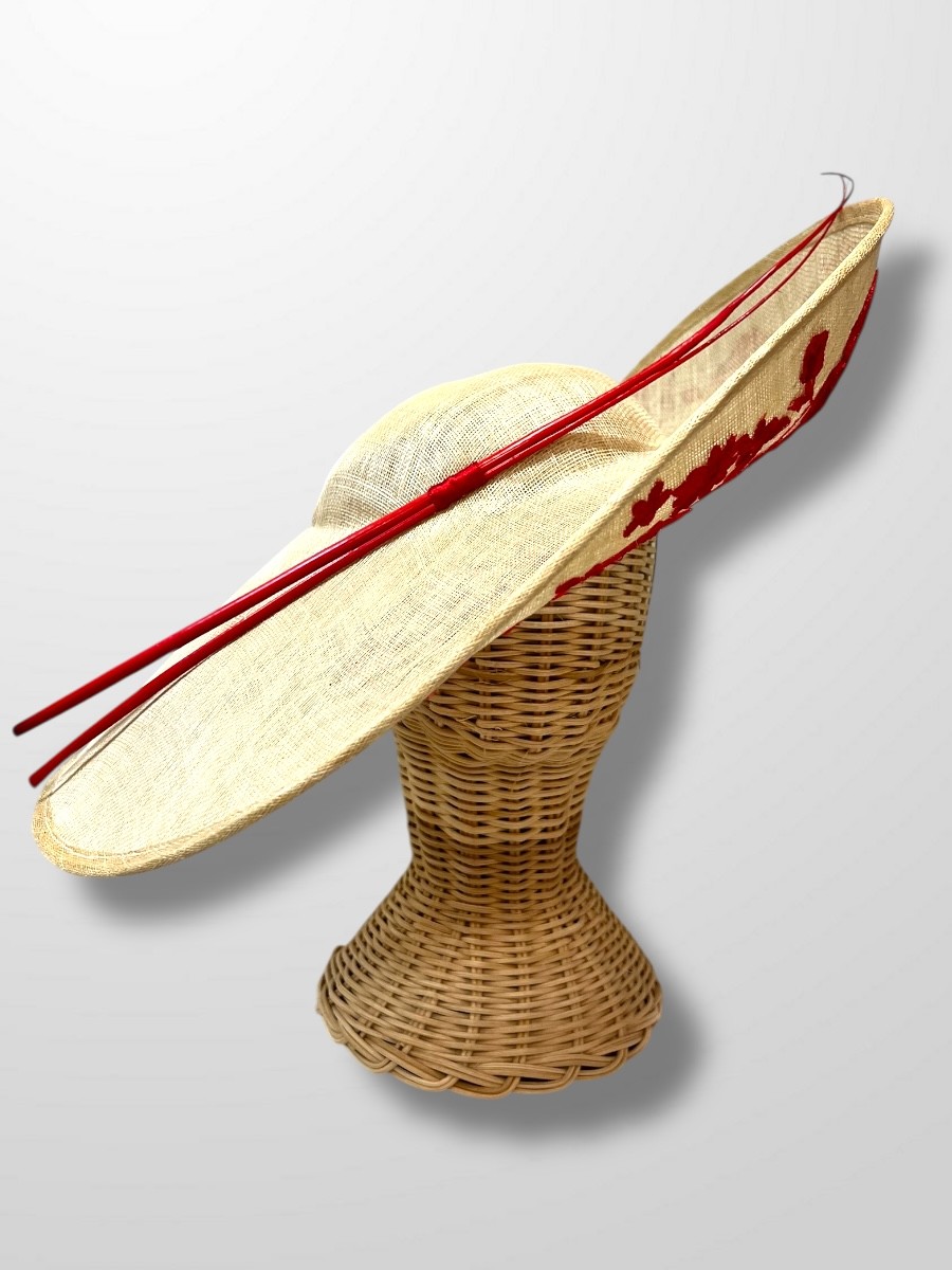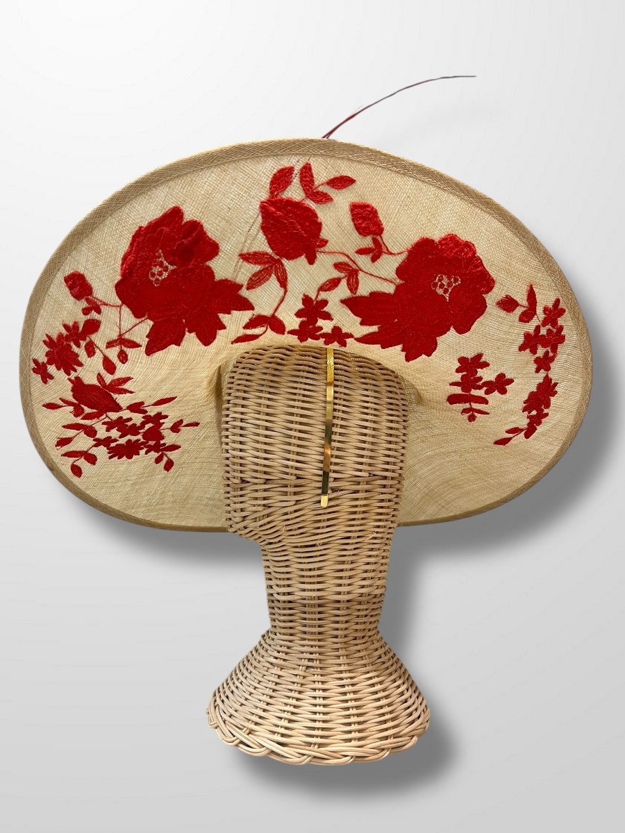 Pamela de sinamay de color natural con ala levantada adornada con bordados y rakis en rojos.