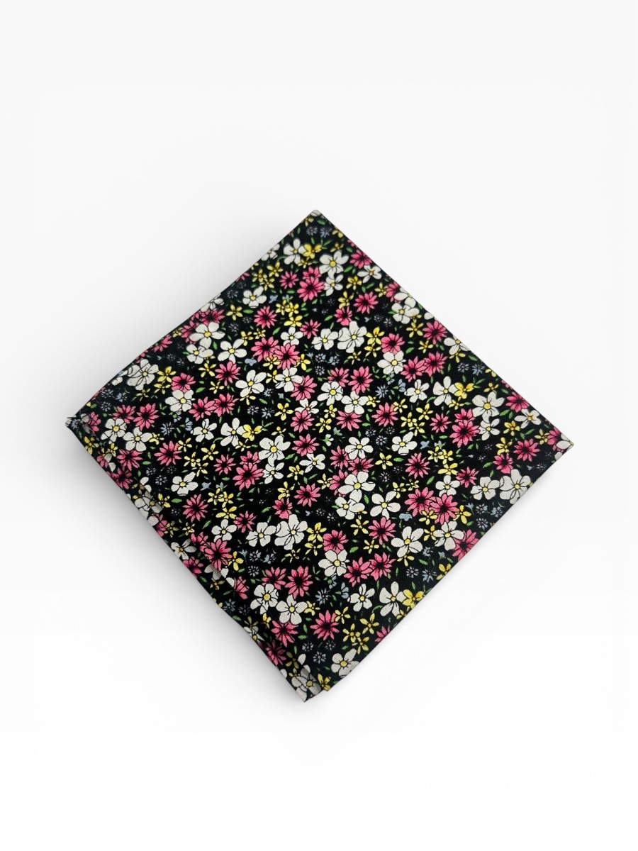 Pañuelo de caballero con fondo oscuro y flores en tonos fucsia y blancas.