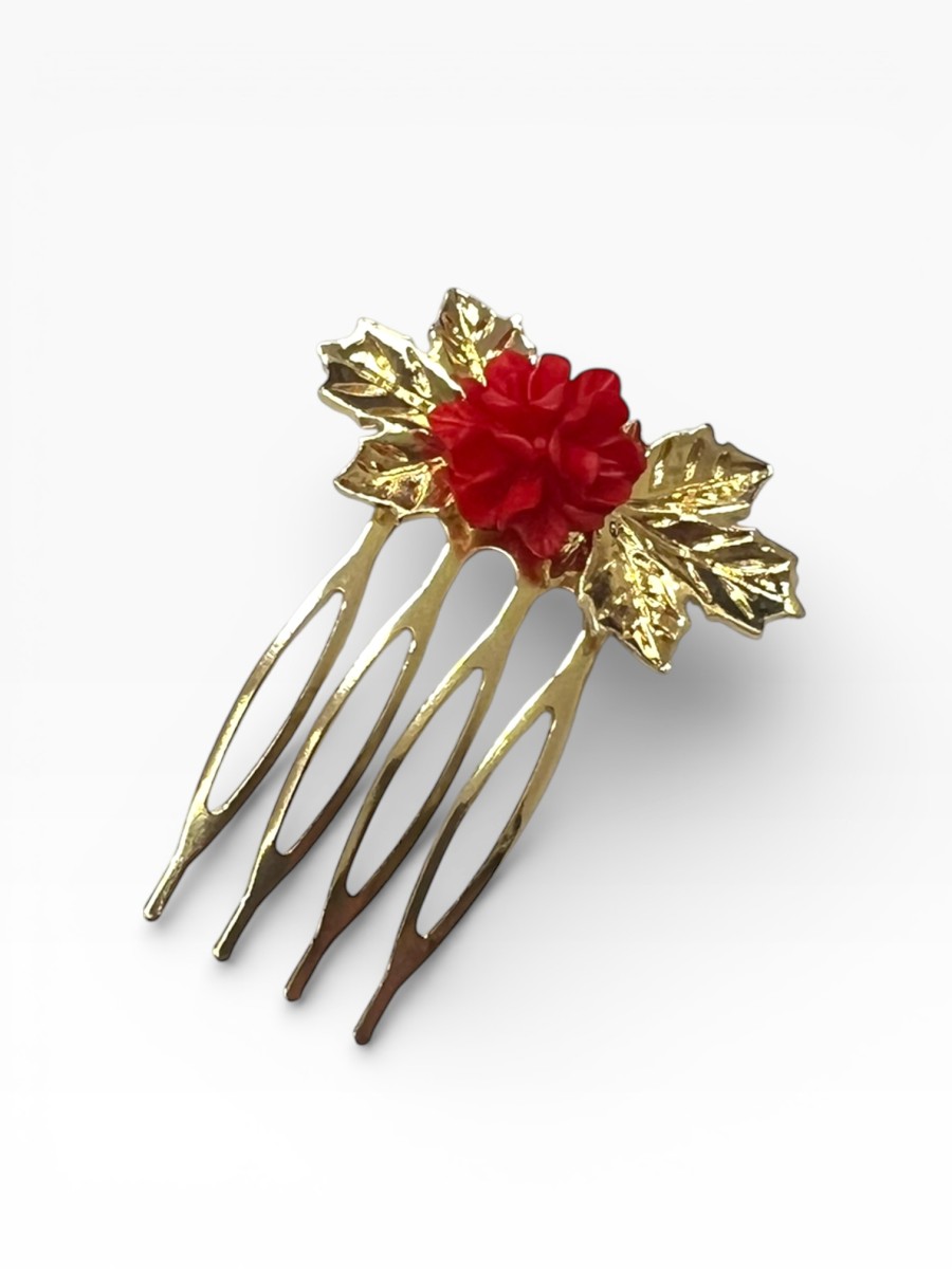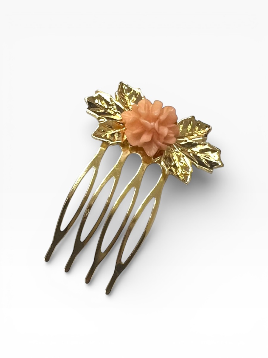 Peinecillo con dos hojitas de parra doradas y una flor central de resina de color.