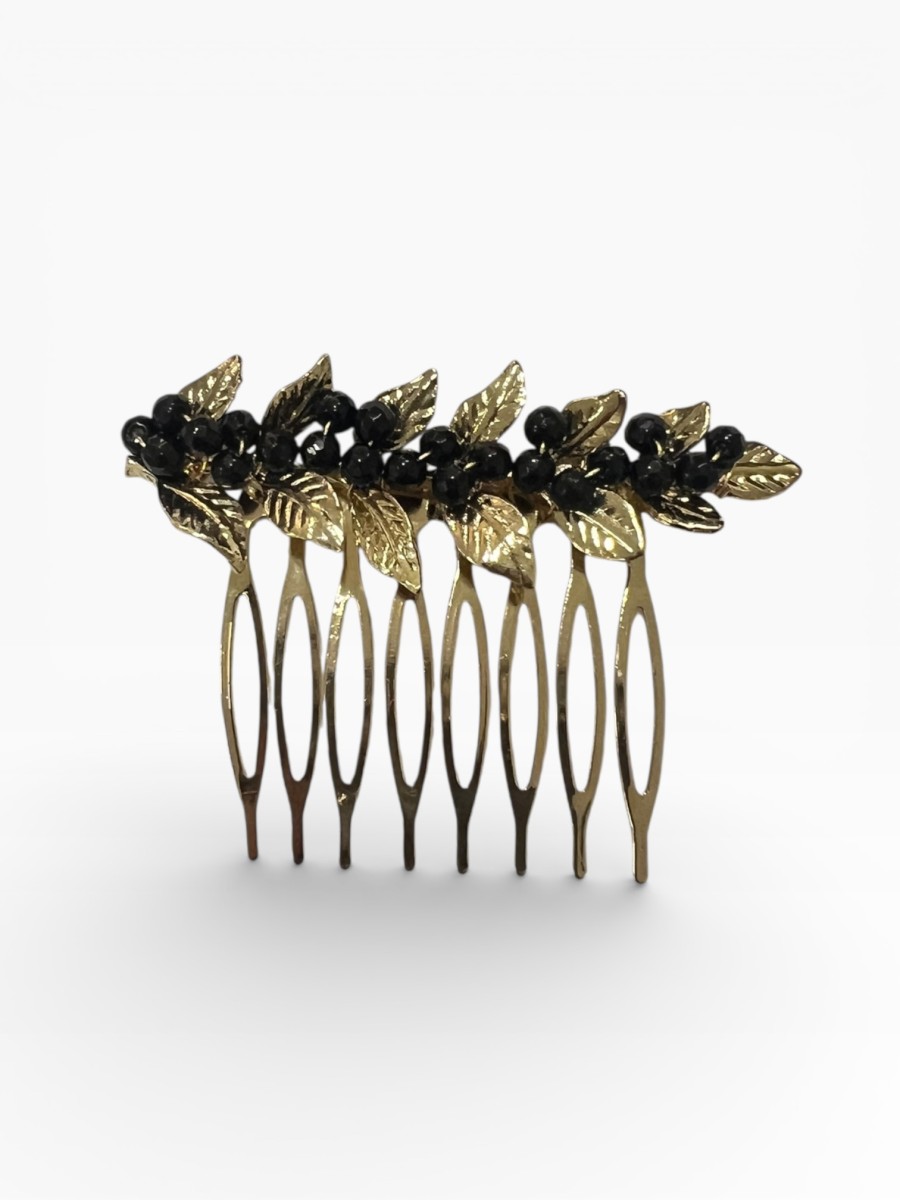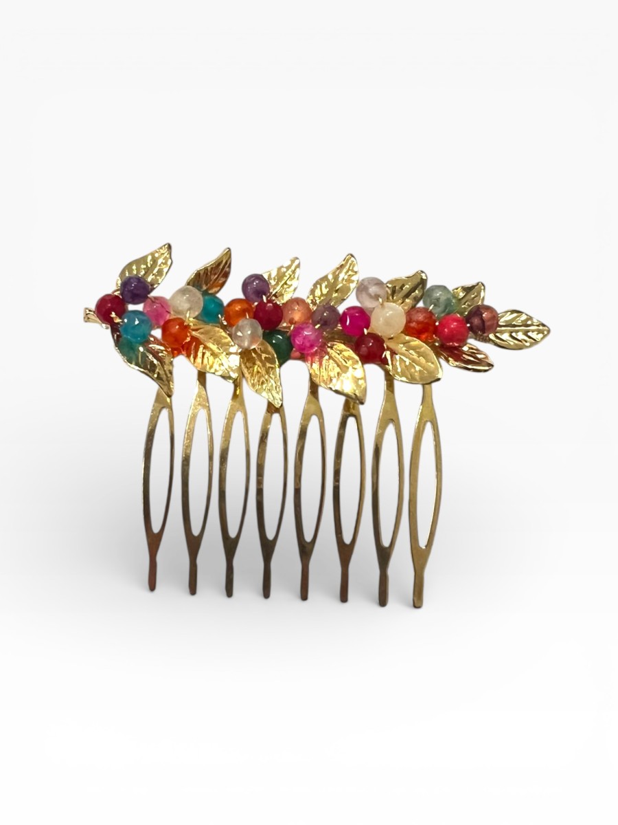 Peinecillo de metal dorado con forma de hojitas y bolitas de colores.