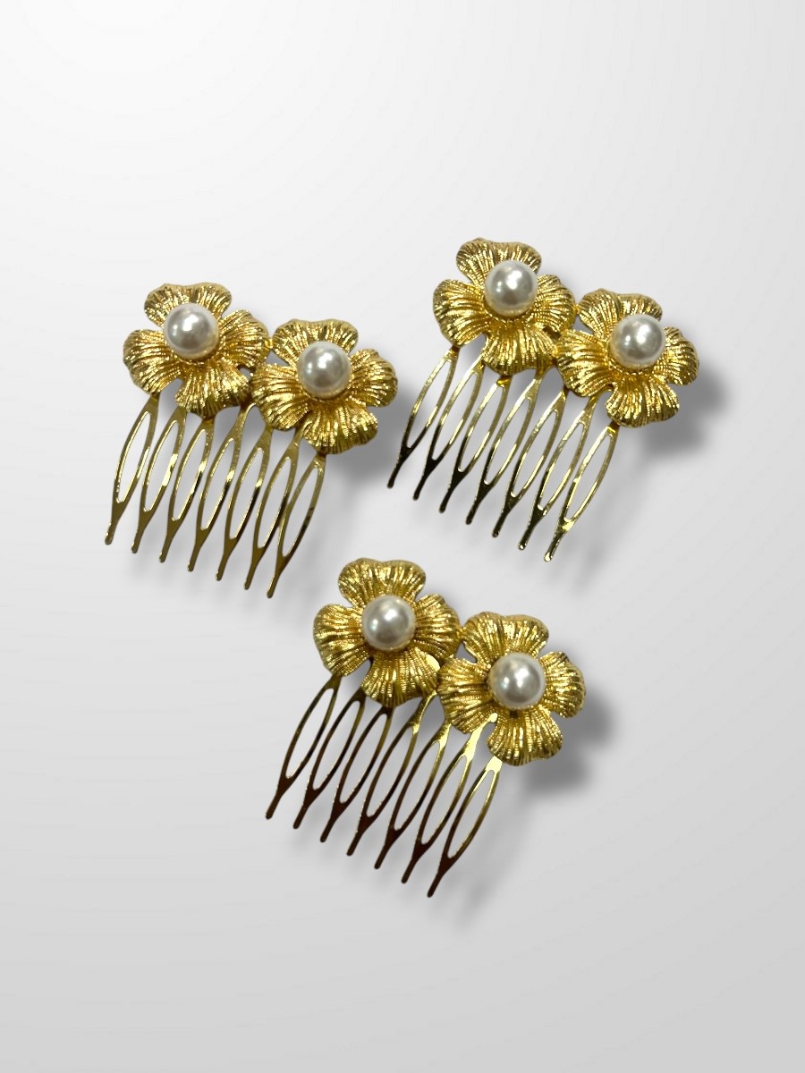 Peinecillo con dos flores doradas con pistilos de perlas.