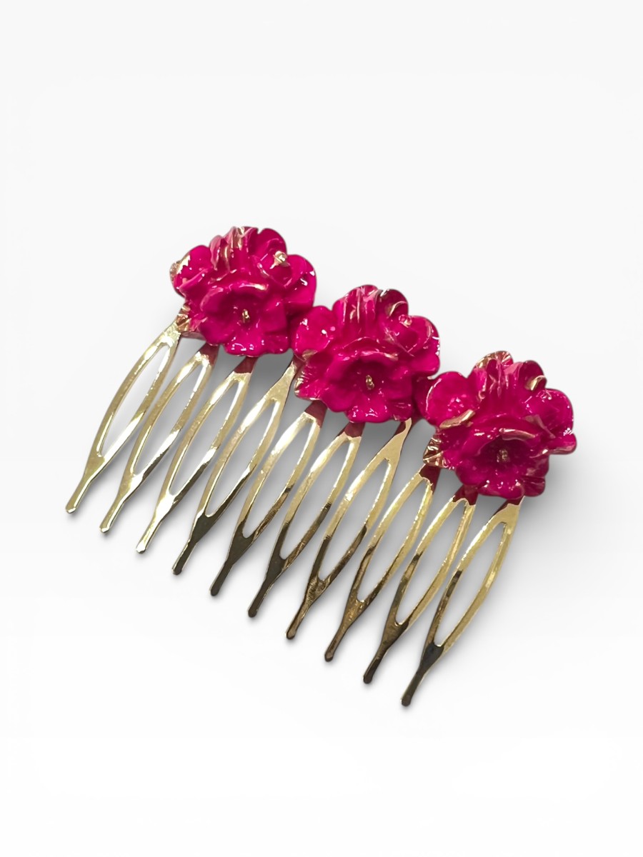 Peinecillo con flores de resina y envejecido con dorado viejo. Medidas aproximadas: 5 cm de largo por 2 cm de ancho