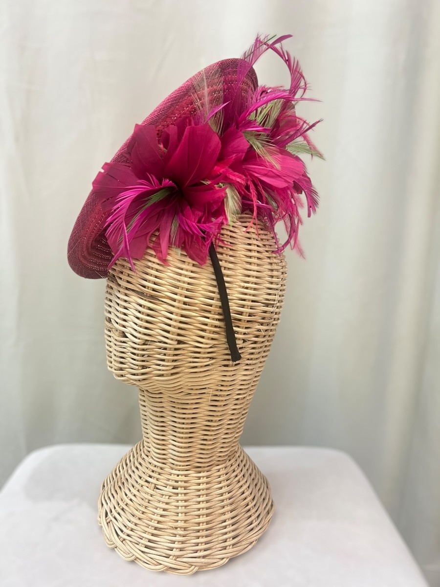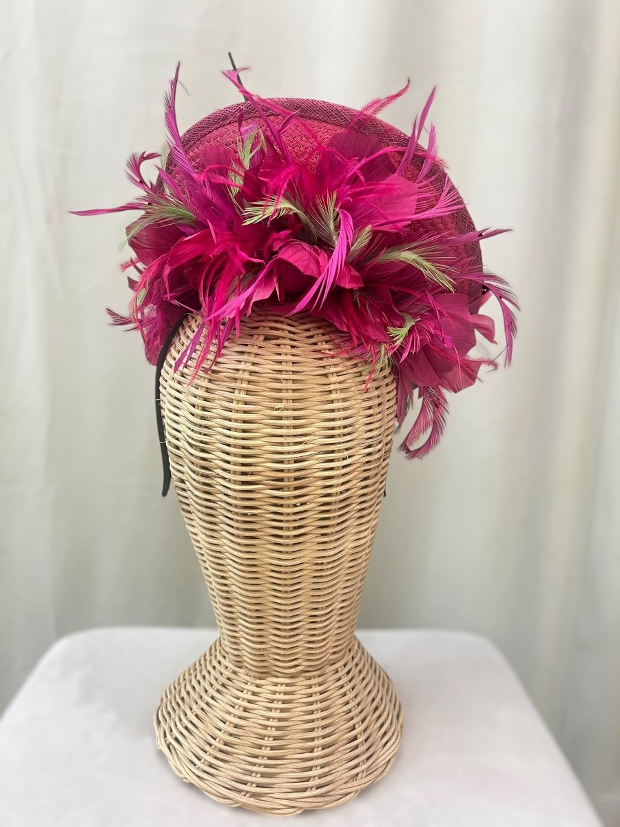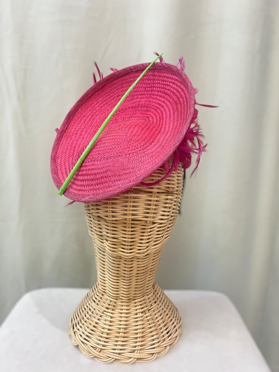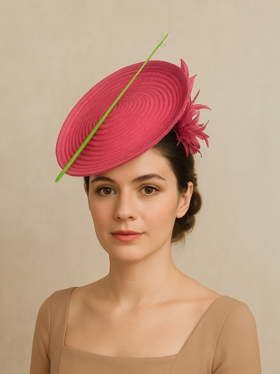 Tocado tipo plato en color buganvilla con plumas en el mismo color y un toque de lima. Lleva un raki lima en la parte delantera que aporta verticalidad y elegancia.