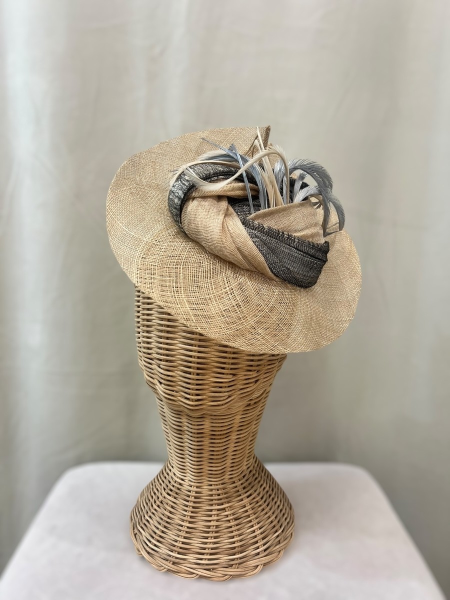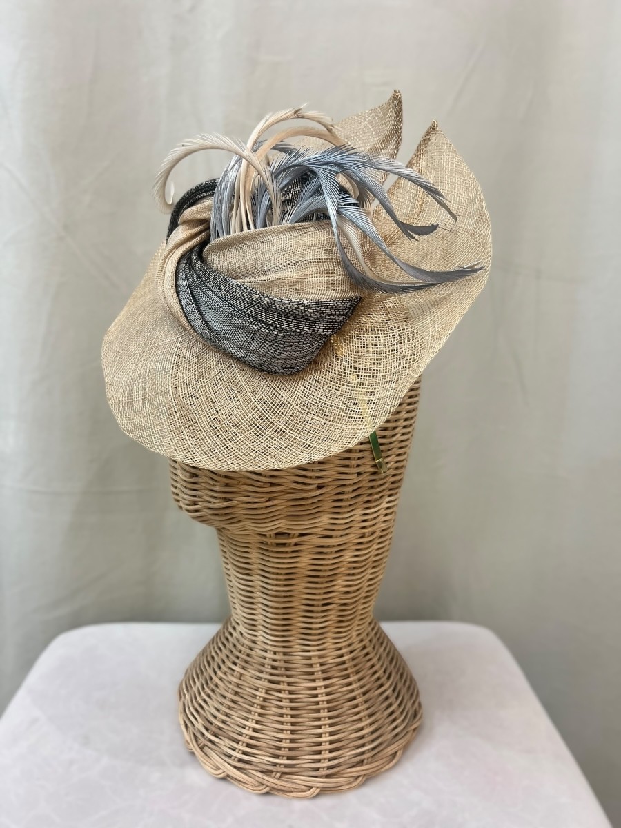 Tocado de base nude con sinamay seda a tono y gris. Lleva plumitas rizadas plateadas.